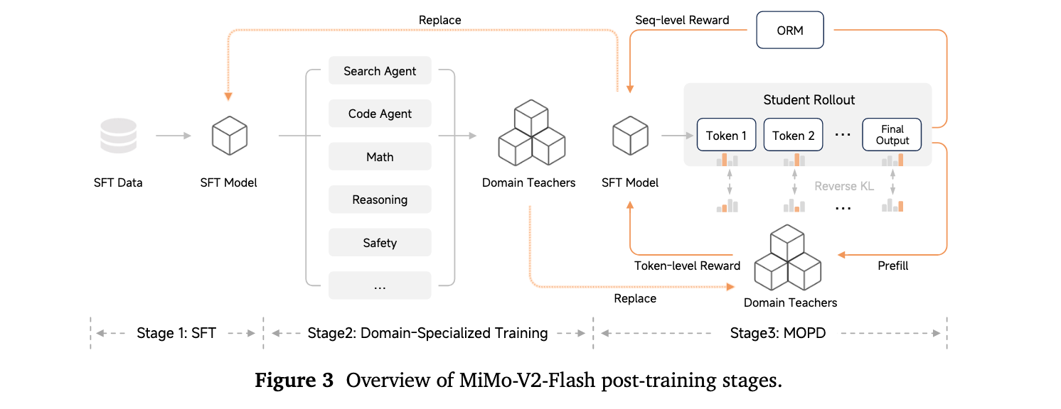 MOPD是MiMo-V2-Flash的核心后训练创新,通过三阶段框架解决能力失衡和学习低效问题: