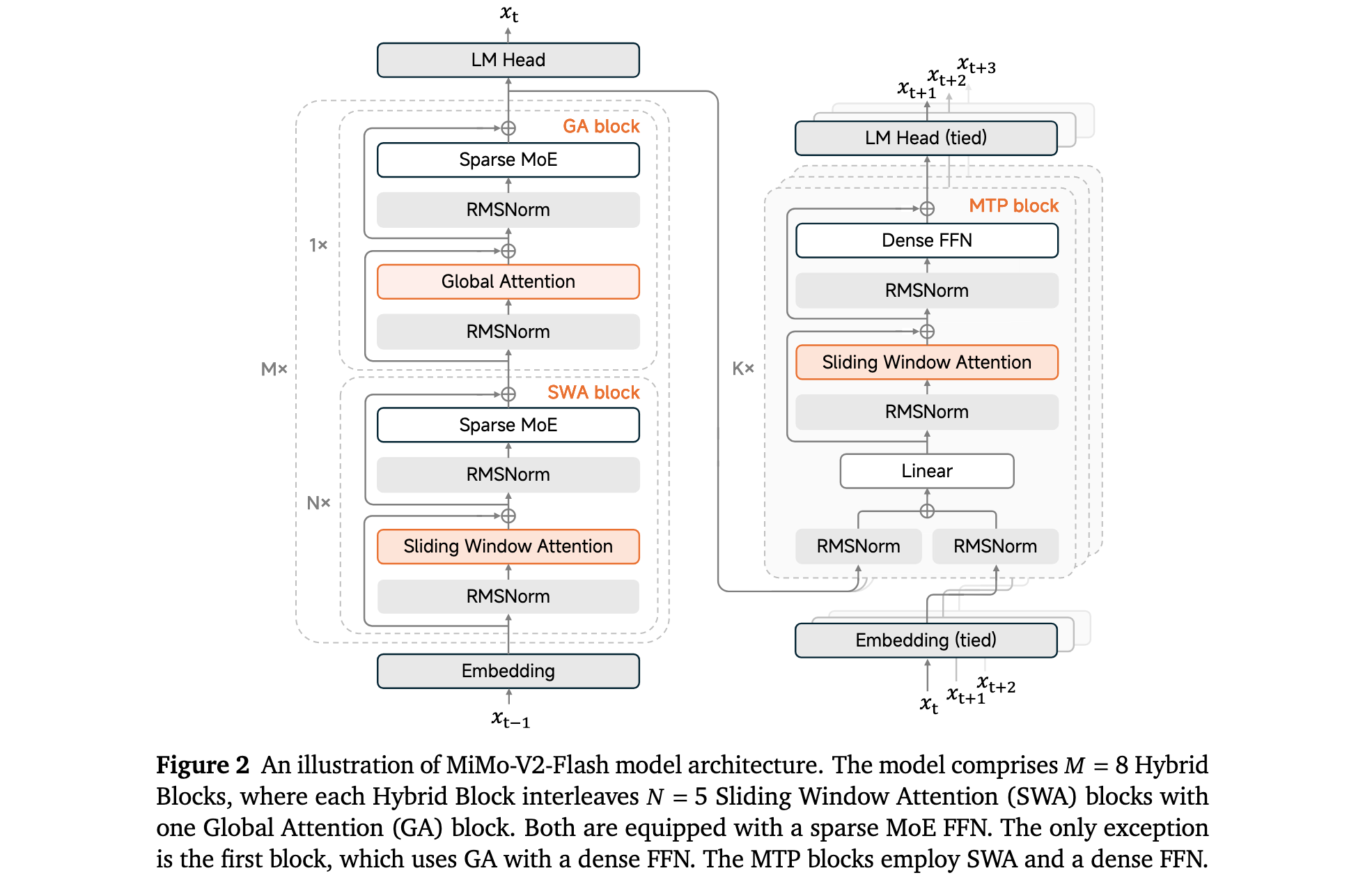 MiMo-V2-Flash的核心架构采用Transformer骨干,增强了MoE和混合注意力机制。模型堆叠8个混合块(Hybrid Block),每个混合块包含5个连续的滑动窗口注意力(SWA)层和1个全局注意力(GA)层,形成5:1的混合比例。唯一例外是第一个Transformer块使用全局注意力配合dense FFN以稳定早期表示学习。