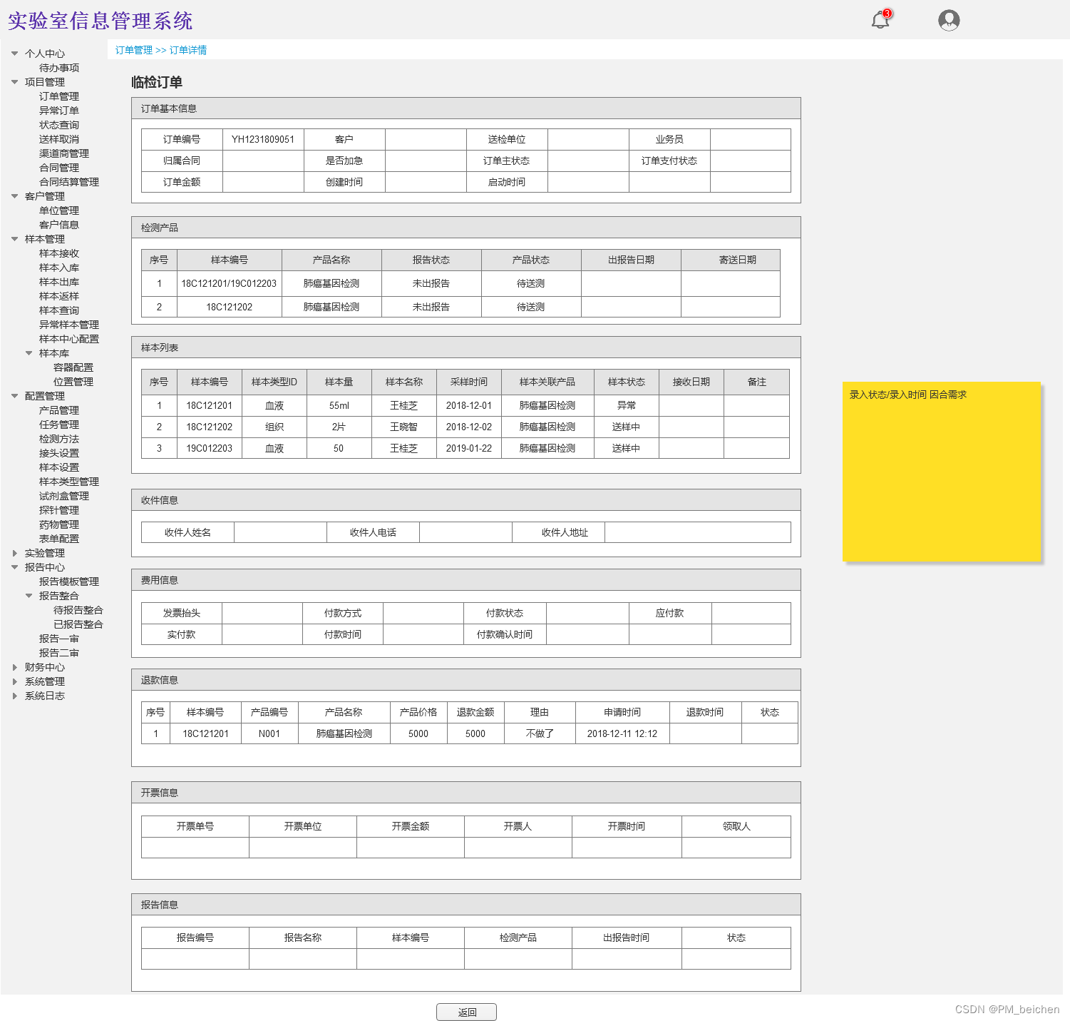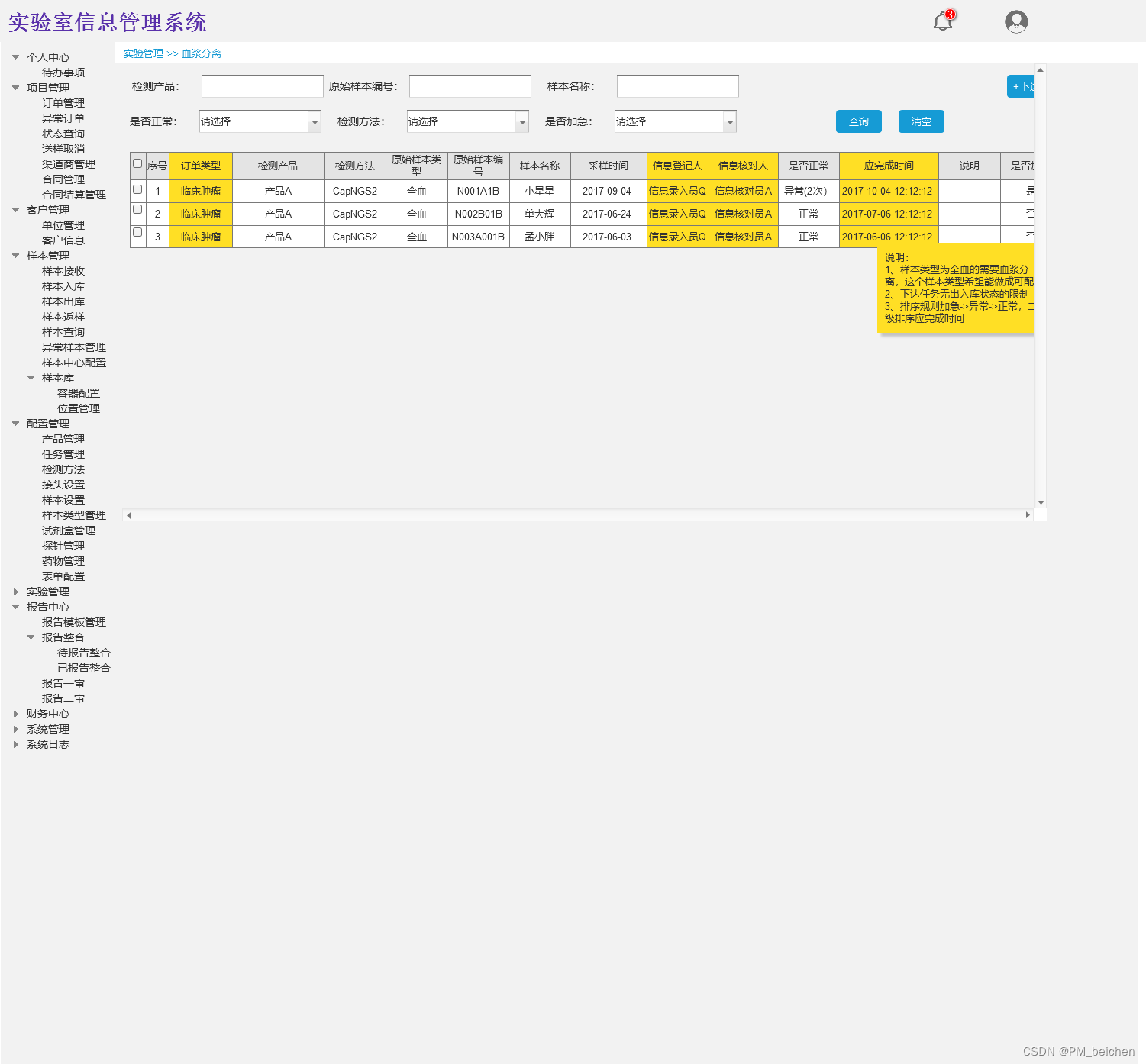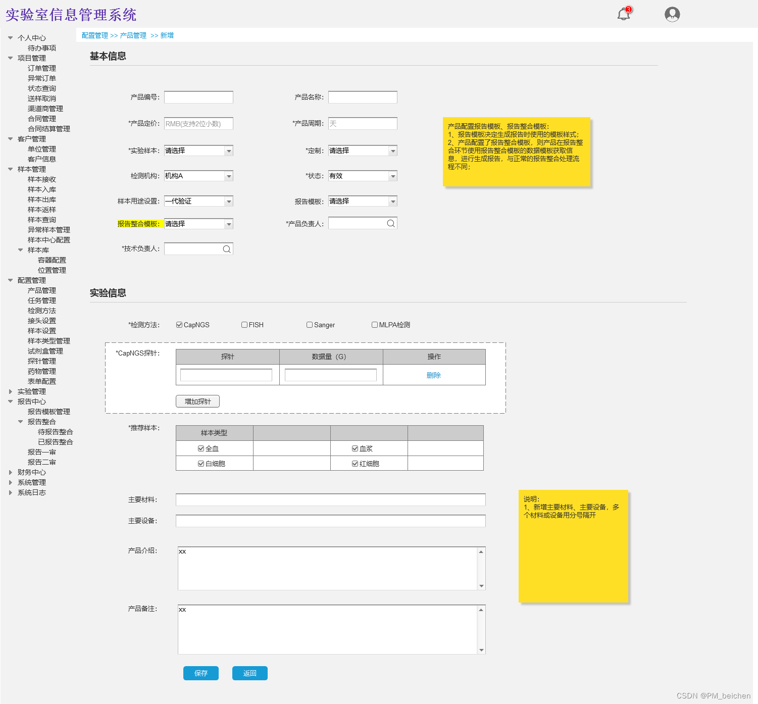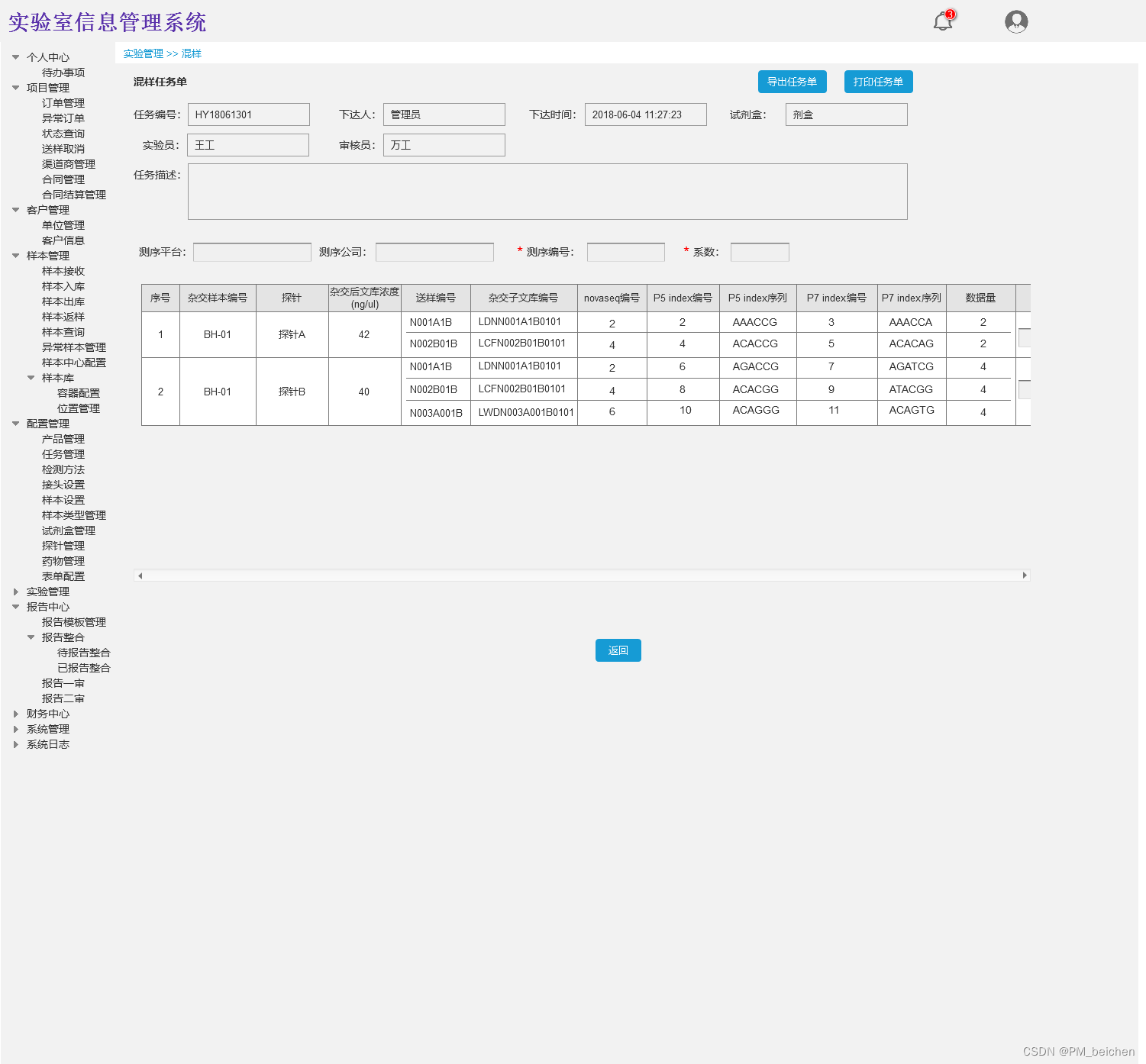 LIMS实验室信息管理系统、LIMS系统、样本中心、样本库、样本接收、样本返样、实验中心、实验节点、报告中心、探针、试剂盒、fish检测、药物管理、基因检测、容器管理、病理诊断、核酸质检、血浆分离、核酸提取、混样处理、文库质检、文库杂交捕获、定量、生信、数据字典、表单配置、Axure原型、产品原型、HTML