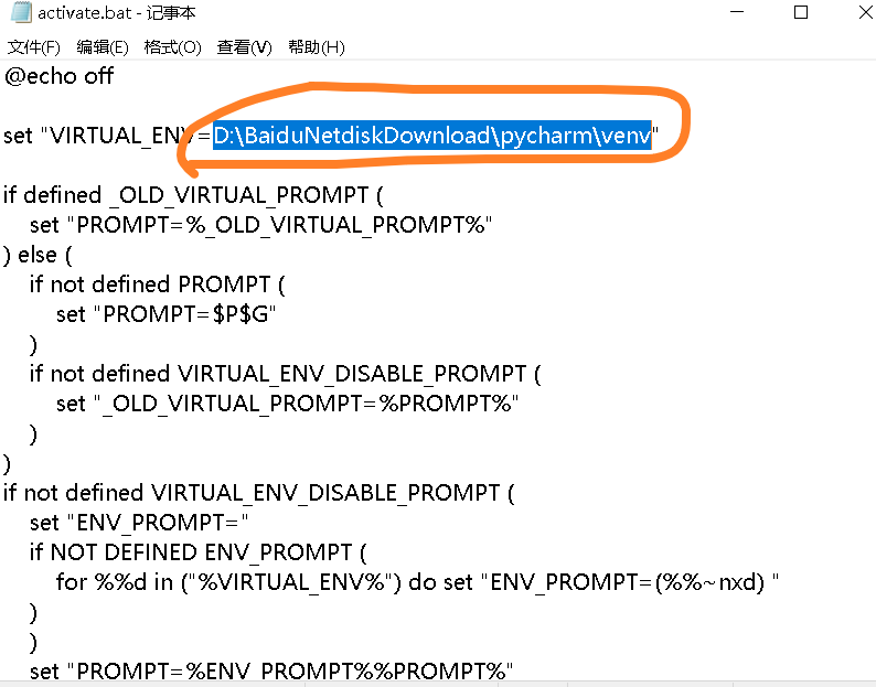 步骤(1):将虚拟环境中script文件夹下的activate文件和activate.dat文件中的旧虚拟环境绝对地址改成新地址。比如我的旧地址是下面画圈圈的部分,改成新地址【D:\Program Files\python\venv38\py-cv-learning】。注意,两个文件中的这个部分,非常相似!