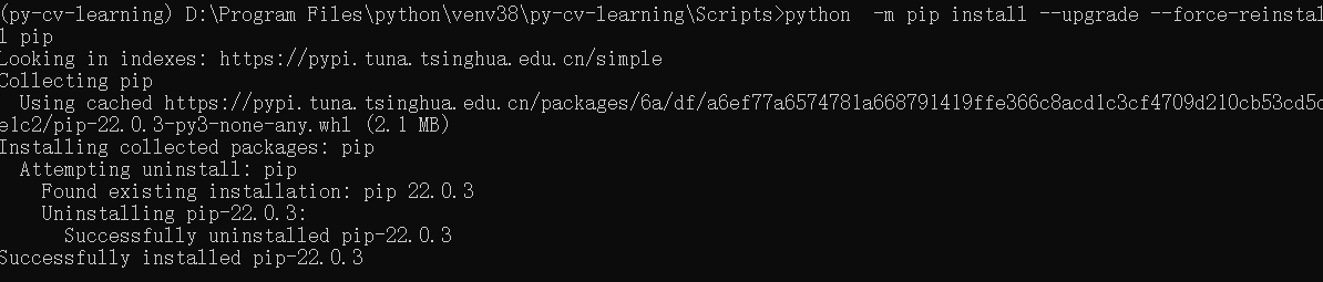 步骤(2):在新地址中激活虚拟环境,然后使用命令【python -m pip install --upgrade --force-reinstall pip】。
