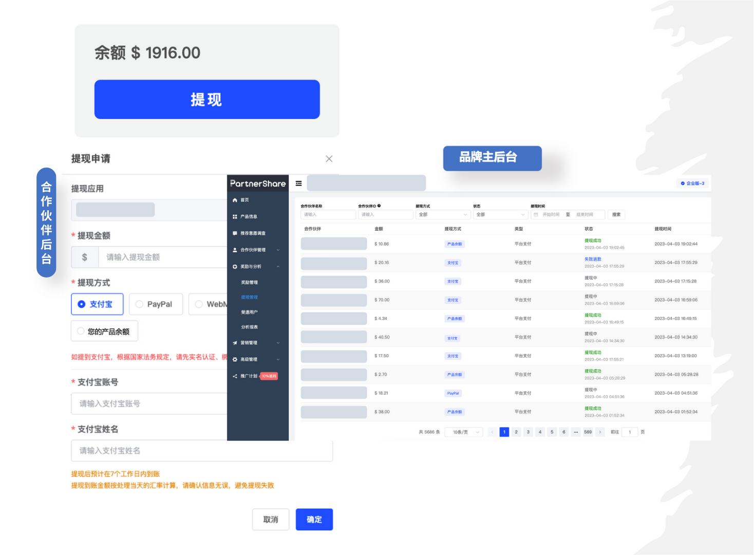 合作伙伴通过推广获得的奖励可以直接提现到支付宝、PayPal等,如果产品有余额体系,PartnerShare也支持将奖励提现到产品余额。
