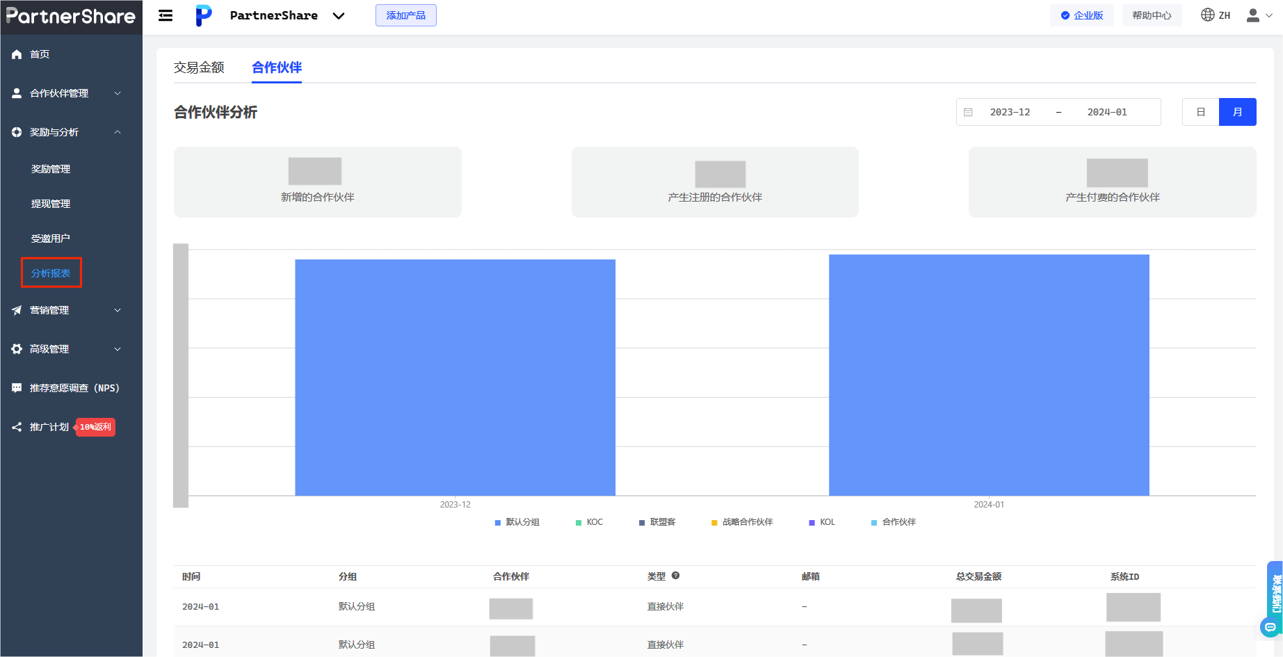 在过程中,品牌主需要密切关注新用户增长、老用户活跃度、邀请成功率等数据指标。根据数据反馈,及时调整激励策略和活动形式,确保计划的顺利进行。在PartnerShare后台,您可以查看“分析报表”,了解合作伙伴的推广详情,推广效果一目了然。