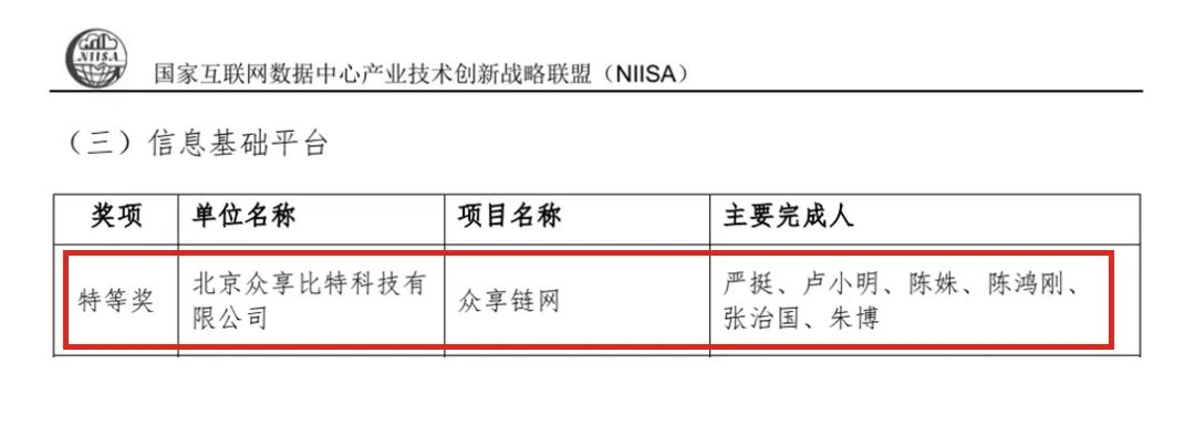 2022年9月30日,互联网数据中心产业创新战略联盟(以下简称NIISA联盟)公布了2021年度技术创新奖。国内首个分布式共治的产业级联盟链体系——众享链网荣获NIISA联盟2021年度技术创新奖信息基础平台特等奖。