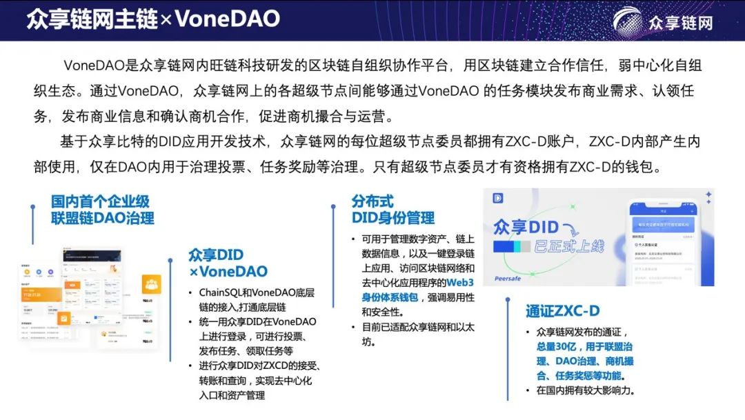 众享链网通过使用VoneDAO平台打造国内首个企业级联盟DAO,基于VoneDAO模块化功能,各超级节点可以自由发布商业合作需求、认领任务、确认合作,促进商机撮合与运营,实现全流程智能合约自动化。目前VoneDAO平台已开放商机撮合功能,超级节点可以在VoneDAO内通过使用ZXCD积分,自由进行任务发布与任务领取。ZXCD秉承内部产生内部使用的原则,充分发挥众享链网生态内各节点效能,以开源开放的形式集聚企业力量,提升超级节点推介活力,打造共建、共治、共享的区块链产业生态。