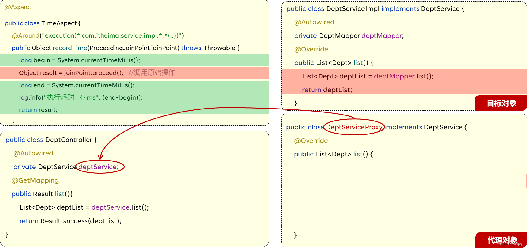 - 实现:动态代理是面向切面编程最主流的实现。而SpringAOP是Spring框架的高级技术,旨在管理bean对象的过程中,主要通过底层的动态代理机制,对特定的方法进行编程。