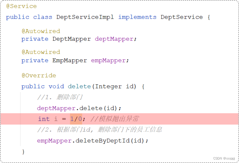 即使程序运行抛出了异常,部门依然删除了,但是部门下的员工却没有删除,造成了数据的不一致。