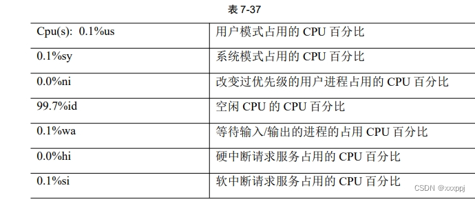 PID:进程的 ID 号 %CPU:该进程占用 CPU 资源的百分比,占用越高,进程越耗费资源; %MEM:该进程占用物理内存的百分比,占用越高,进程越耗费资源;