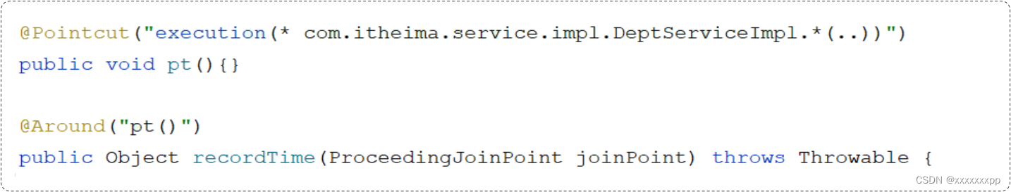 l 导入依赖:在 pom.xml 中导入 AOP 的依赖<dependency> <groupId>org.springframework.boot</groupId> <artifactId>spring-boot-starter-aop</artifactId> </dependency>l 编写 AOP 程序:针对于特定方法根据业务需要进行编程package com.itheima.aop;/* * * @author pengjx * * */ import com.github.pagehelper.Page; import lombok.extern.slf4j.Slf4j; import org.aspectj.lang.ProceedingJoinPoint; import org.aspectj.lang.annotation.Around; import org.aspectj.lang.annotation.Aspect; import org.springframework.stereotype.Component; @Component @Slf4j @Aspect public class TimeAspect { @Around("execution(* com.itheima.service.*.*(..))")//切入点表达式 public Object recordTime(ProceedingJoinPoint joinPoint) throws Throwable { long begin = System.currentTimeMillis(); Object proceed = joinPoint.proceed(); long end = System.currentTimeMillis(); log.info(joinPoint.getSignature()+"方法执行耗时:{}",end-begin); return proceed; } }