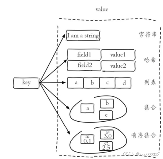 Redis存储的是key-value结构的数据,其中key是字符串类型,value有5种常用的数据类型: