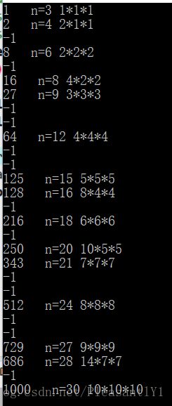 打表如图:然后发现,能出解的情况只有能被3.4整除的数,当能被3整除时,abc相等,当能被4整除且不被3整除时a=2b=2c。