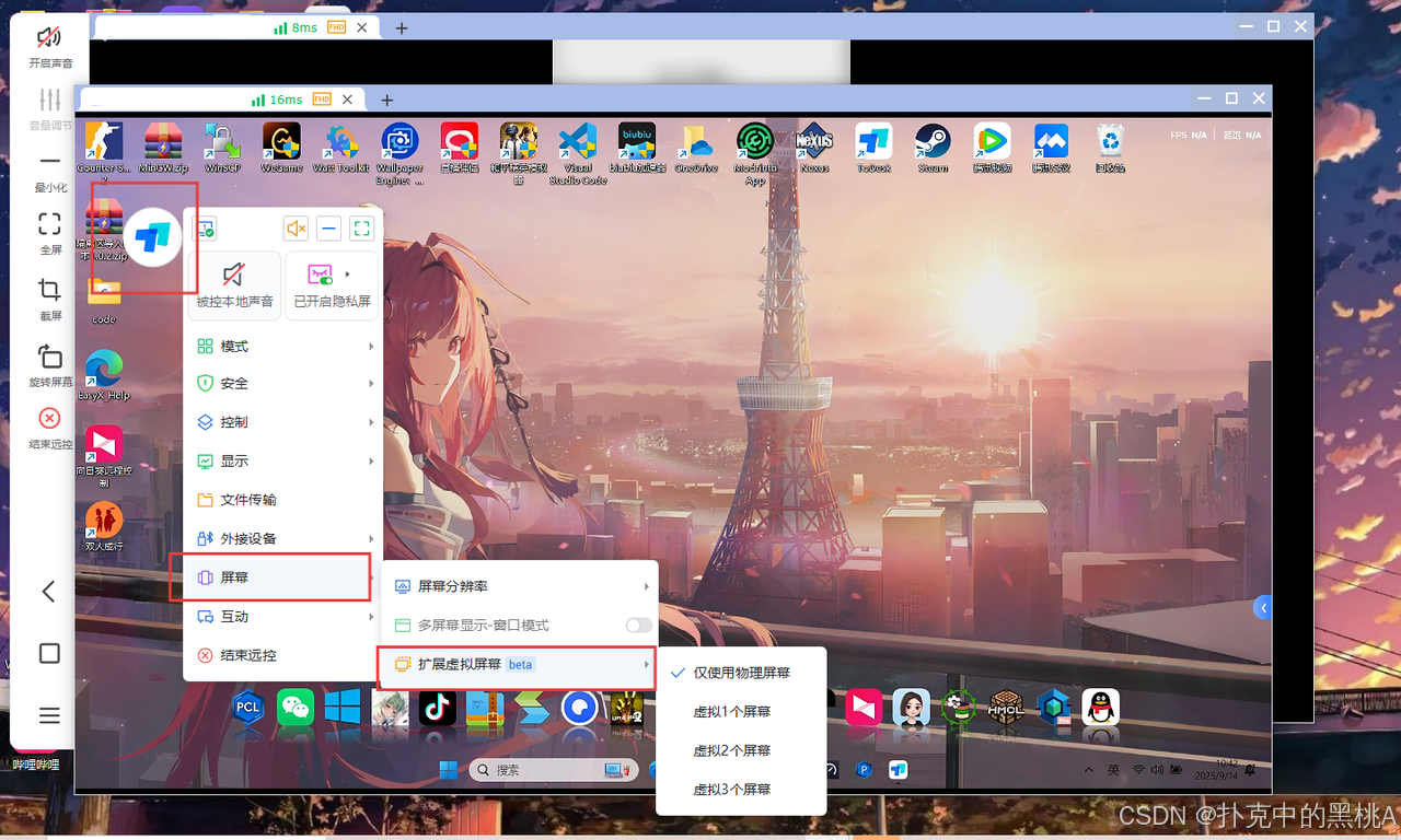 1.在远程到被控后,点击【悬浮窗菜单栏】->【屏幕】->【扩展虚拟屏幕】,可以选择虚拟 1-3 个屏幕,被控即可开启多屏体验。