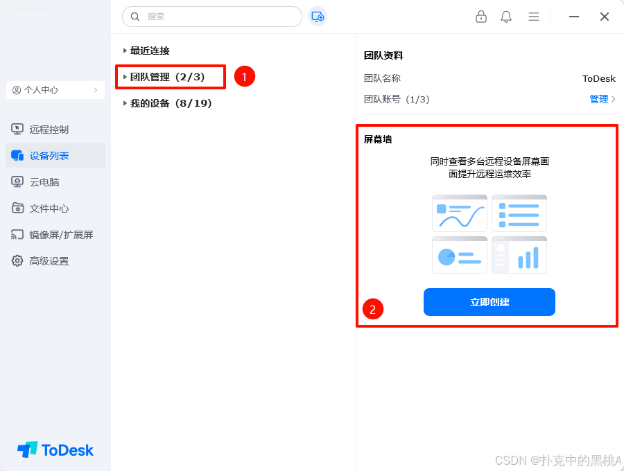 1.创建团队,添加好需要管理的设备后,在客户端设备列表界面,点击团队管理,可以看到创建屏幕墙