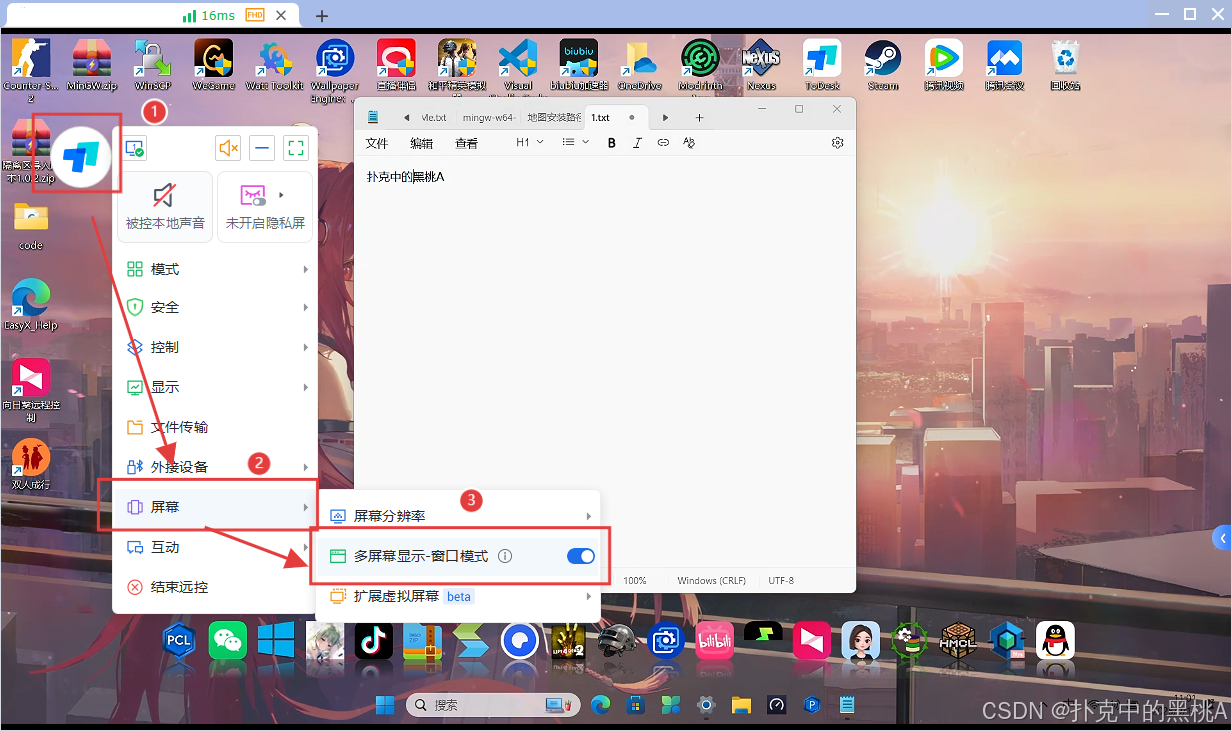 1.【工具栏】->【屏幕】-> 【多屏幕显示-窗口模式】,被控具备多屏幕或虚拟多屏幕时,开启该功能,则可以以多窗口模式展开。