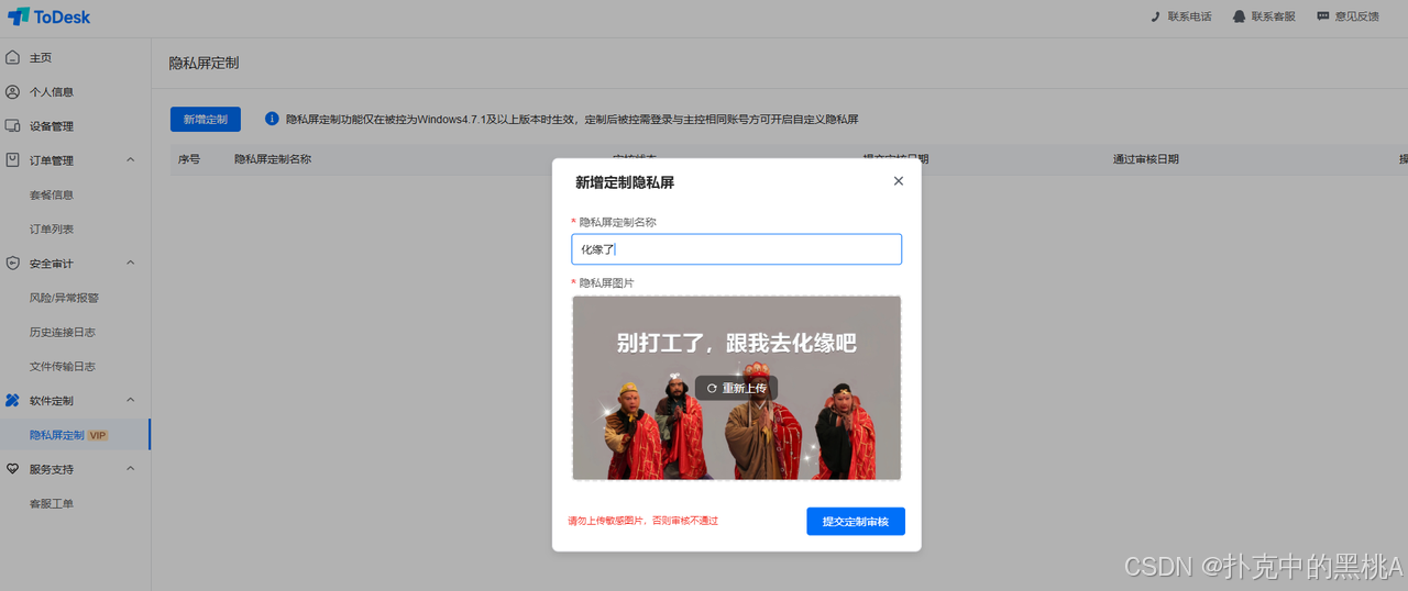1.【官网登录个人中心】-[软件定制]-[隐私屏定制]-[上传图片]-[提交定制审核]。