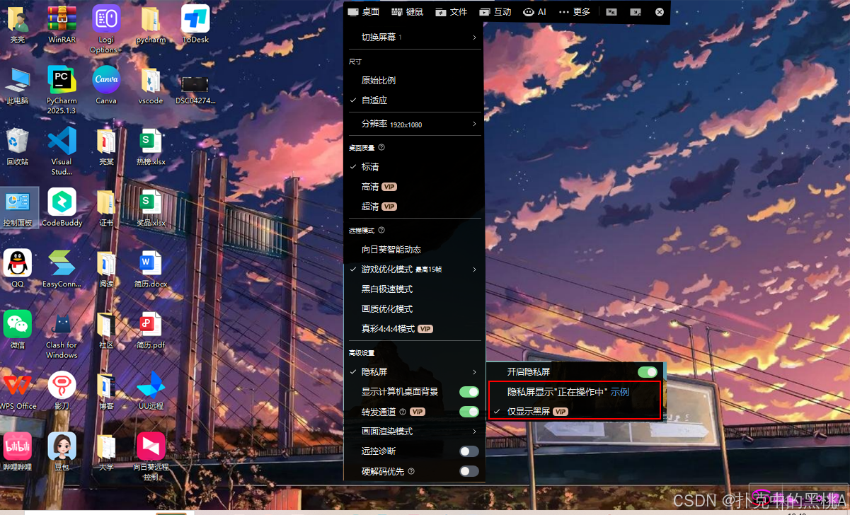 向日葵: “场景化显示选择”可以把被控端的屏幕内容藏起来,你想让它显示“正在操作中”或者就干脆黑屏都行,按需切换。不过这功能得是会员及以上级别才能用,有付费门槛,版本也有限制,而且它还没法关闭物理显示器,少了点高阶保护的能力,但不同隐私场景它还是能匹配上的。