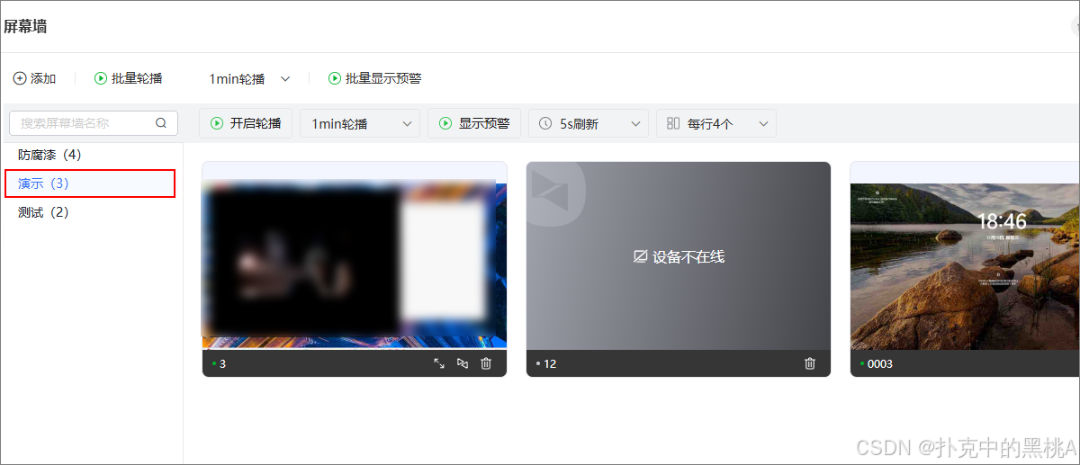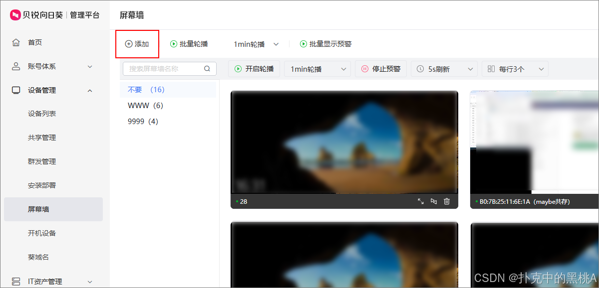 1.【向日葵管理平台】->【设备管理】->【屏幕墙】 -> 【+添加】 ;