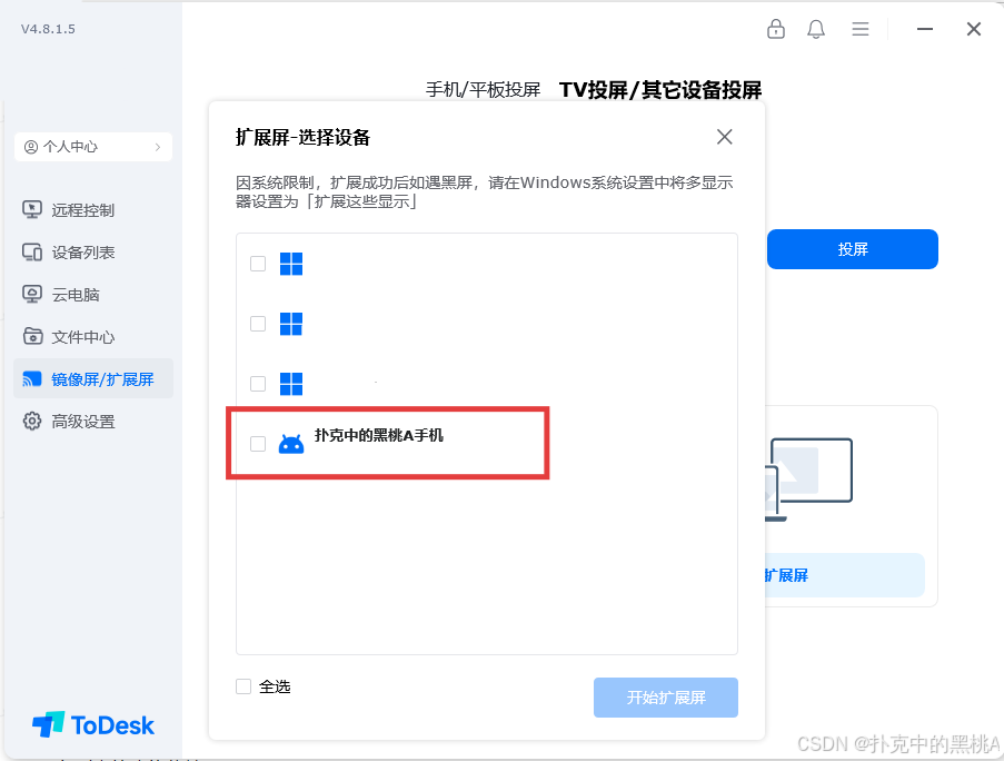 2.然后选择连接的设备,点击【开始扩展屏】: