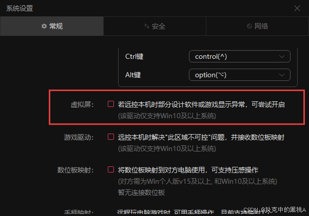 异常适配虚拟屏:只有:若远控本机时部分设计软件或游戏显示异常,可尝试开启。只能用于解决特定软件远程显示问题。