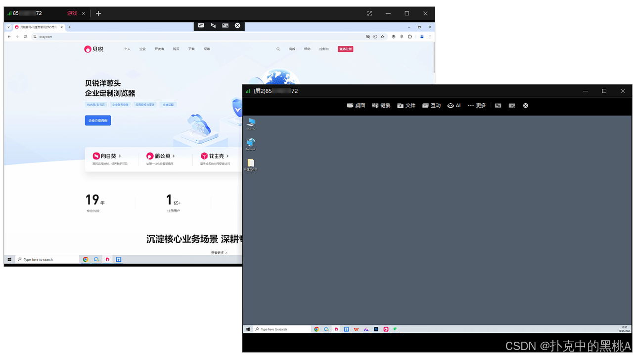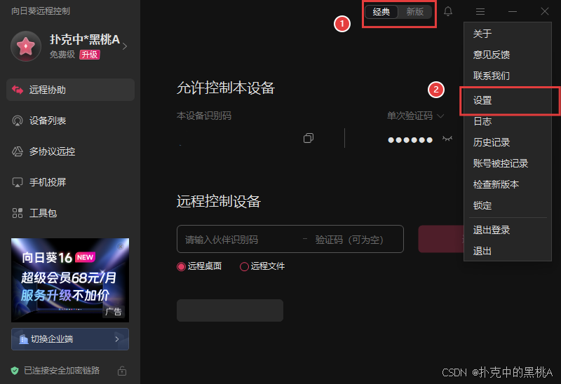 这个功能有版本限制,操作相对复杂,需要向日葵个人版 v15.8.3.19819 for Windows 及以上(主被控都需要该版本),黑屏则需要会员及以上级别。