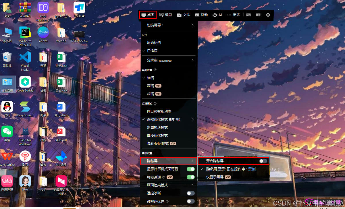 强隐私模式:关闭被控端显示器,仅使用虚拟屏幕,无法看到操作,节省能耗同时保护隐私。