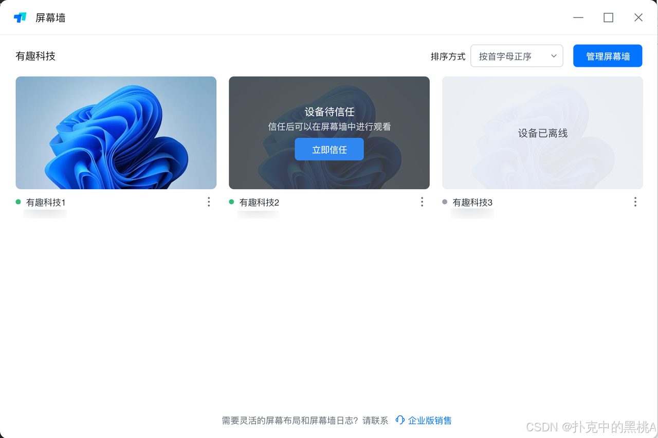 | 屏幕墙 | 用一个控制端(如电脑)集中展示、管理**多台被控设备**的屏幕画面,可同时查看多设备状态并快速切换控制 | 核心是“多设备集中管控”;画面“并列显示”(如一个界面分 8 个窗口,各对应 1 台设备);依赖远程技术 | 企业 IT 运维,在一个屏幕墙监控 20 台员工电脑的运行状态;连锁门店用屏幕墙查看 10 家分店的收银台屏幕 |