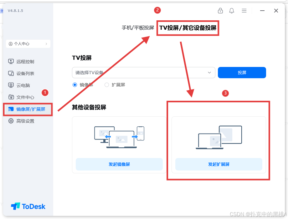 1.侧边栏导航栏的【扩展屏/镜像屏】功能,选择【TV 投屏/其他设备投屏】,点击发起【扩展屏】