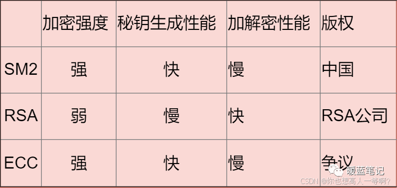 SM2:同样基于椭圆曲线问题设计。最大优势就是国家认可和大力支持。