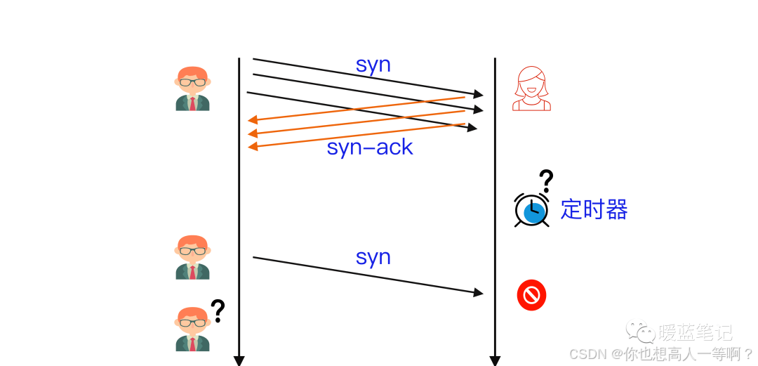 但实际情况是,网络可能不稳定会丢包,使握手消息不能抵达对方,也可能是对方故意不按规矩来,故意延迟或不发送握手确认消息。