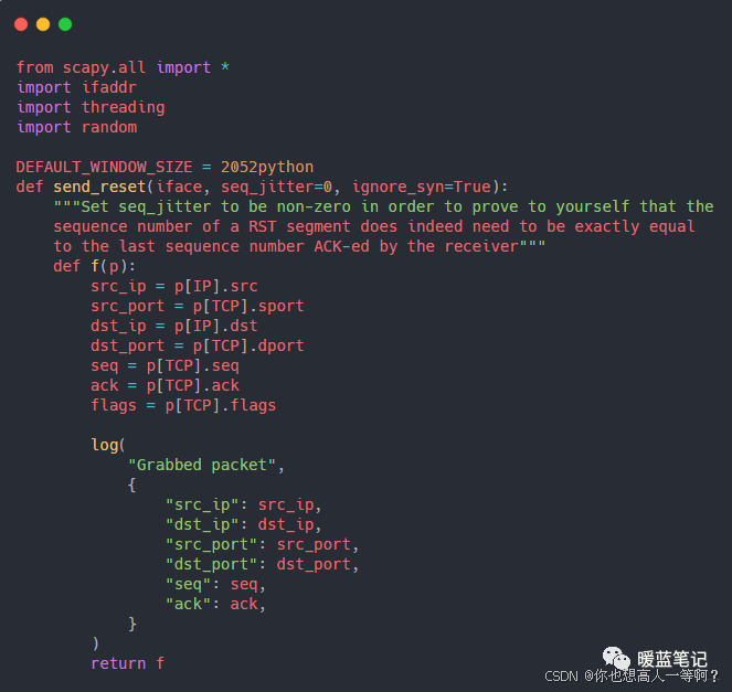 编写一个攻击程序,使用 Python 网络库 scapy 来读取两个终端窗口之间交换的数据,并将其打印到终端上。代码比较长,下面为一部份,完整代码后台回复 TCP 攻击,代码的核心是调用 scapy 的嗅探方法: