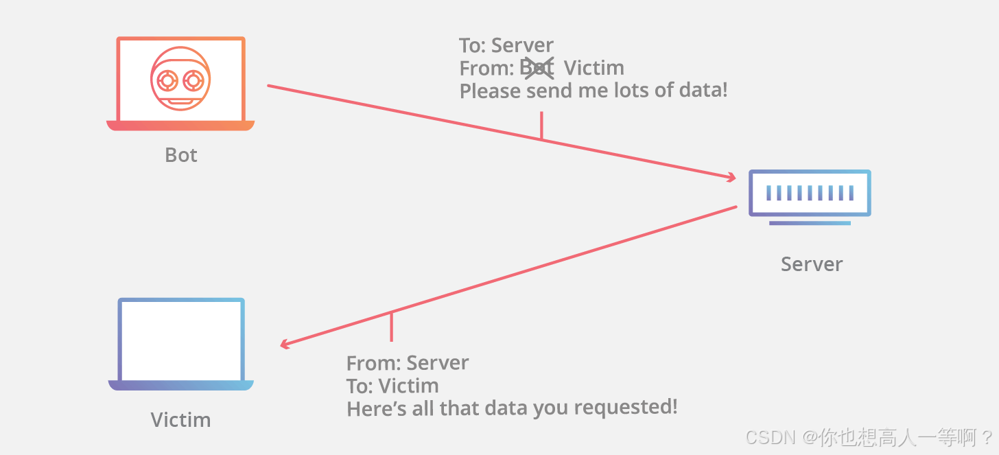 当服务器接收到每个新的 UDP 数据包时,它将通过步骤来处理请求,并利用该过程中的服务器资源。发送 UDP 报文时,每个报文将包含源设备的 IP 地址。在这种类型的 DDoS 攻击期间,攻击者通常不会使用自己的真实 IP 地址,而是会欺骗 UDP 数据包的源 IP 地址,从而阻止攻击者的真实位置被暴露并潜在地饱和来自目标的响应数据包服务器。