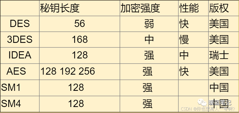 之前几种都是国外的,我们国内自行研究了国密 SM1和 SM4。其中 S 都属于国家标准,算法公开。优点就是国家的大力支持和认可