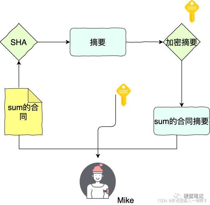 在这样的过程中,Mike 是不能更改 Sum 的合同,因为要修改合同不仅仅要修改原文还要修改摘要,修改摘要需要提供 Mike 的私钥,私钥即 Sum 独有的密码,公钥即 Sum 公布给他人使用的密码