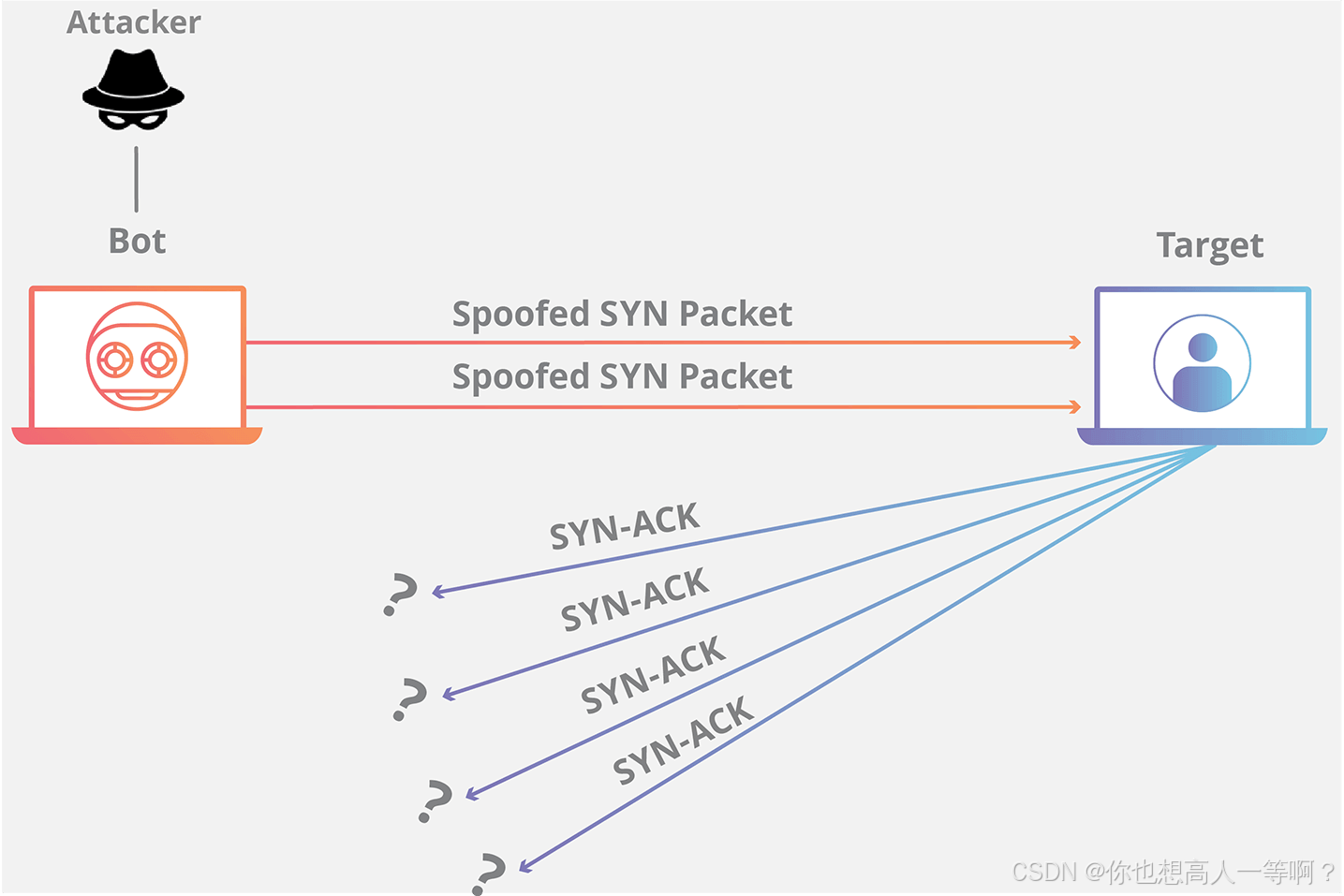 - 欺骗攻击: 恶意用户还可以伪造其发送的各个 SYN 数据包的 IP 地址,以便阻止缓解措施并加大身份暴露难度。虽然数据包可能经过伪装,但还是可以通过这些数据包追根溯源。此类检测工作很难开展,但并非不可实现;特别是,如果 Internet 服务提供商 (ISP) 愿意提供帮助,则更容易实现。