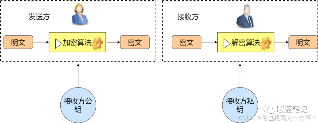 在对称加密中,发送方与接收方使用相同的秘钥。那么在非对称加密中则是发送方与接收方使用的不同的秘钥。其主要解决的问题是防止在秘钥协商的过程中发生泄漏。比如在对称加密中,小蓝将需要发送的消息加密,然后告诉你密码是 123balala,ok,对于其他人而言,很容易就能劫持到密码是 123balala。那么在非对称的情况下,小蓝告诉所有人密码是 123balala,对于中间人而言,拿到也没用,因为没有私钥。所以,非对称密钥其实主要解决了密钥分发的难题。如下图