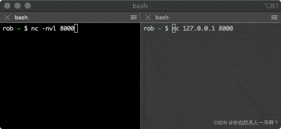 该命令会尝试与上面的服务建立连接,在其中一个窗口输入一些字符,就会通过 TCP 连接发送给另一个窗口并打印出来。