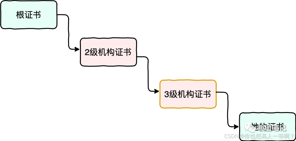 上图中,由信誉最好的根证书机构提供根证书,然后根证书机构去签发二级机构的证书;二级机构去签发三级机构的证书;最后有由三级机构去签发 Sum 证书。