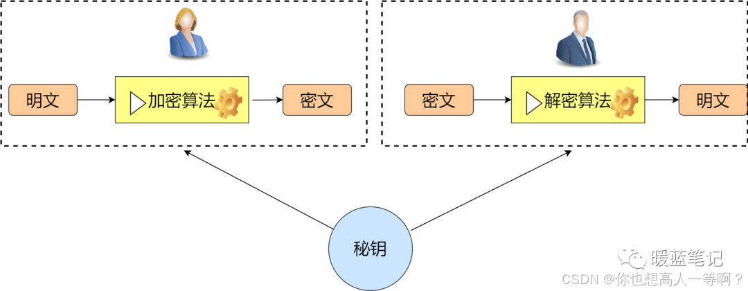对称加密,顾名思义,加密方与解密方使用同一钥匙(秘钥)。具体一些就是,发送方通过使用相应的加密算法和秘钥,对将要发送的信息进行加密;对于接收方而言,使用解密算法和相同的秘钥解锁信息,从而有能力阅读信息。