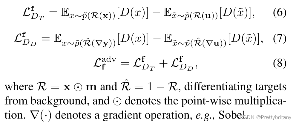 这些判别器的对抗性损失函数计算 Wasserstein 散度,以相互识别前景热目标和背景纹理细节是否真实,定义为: