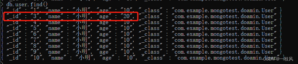 4、修改id为3的user的age为20,图中可以看到已经修改