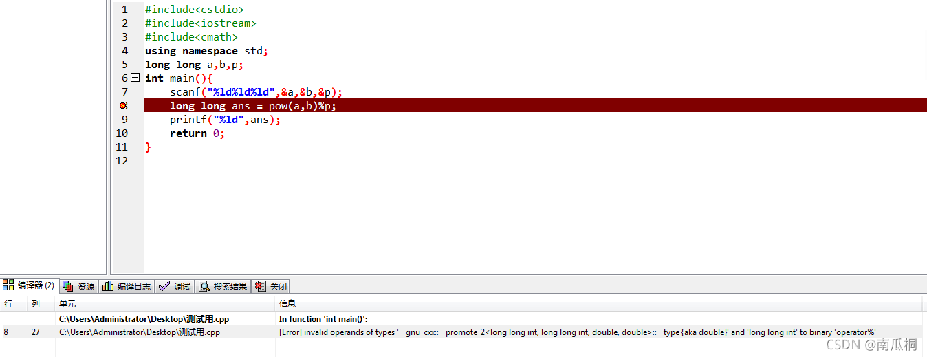 由上图可见,即使开了long long ,这个是数还是太大了,在pow计算的过程中很容易溢出而导致结果错误。