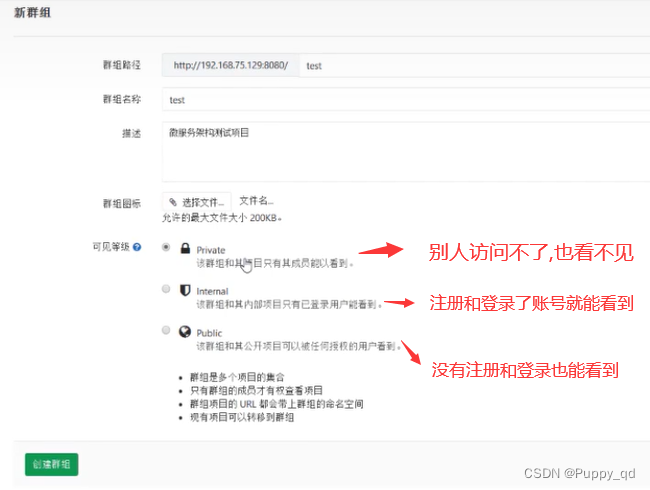 通常情况都是private,将所有需要协同开发的人员拉入群组即可