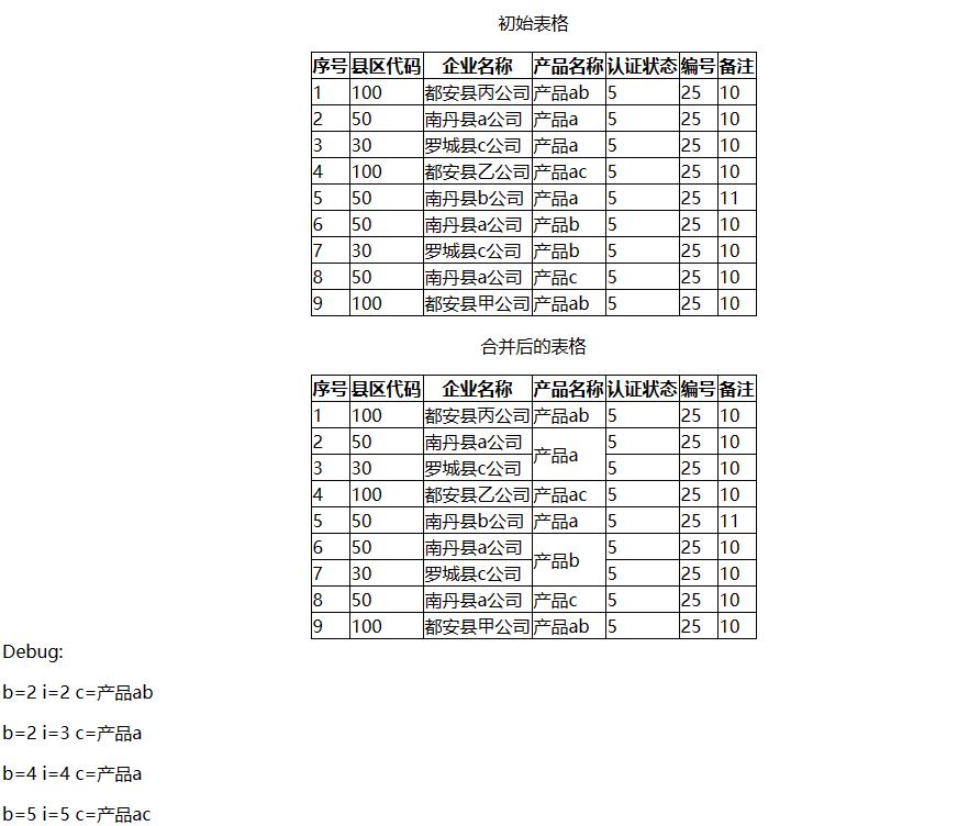 如果两个单元格内容不同,则将变量b保存的行号更新为当前行(第i行),从当前行(第i行)开始新的单元格对比与合并。