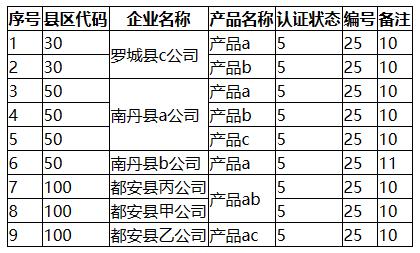 需要特别注意的是我们合并表格中多列单元格时的顺序,是按照从右到左的顺序来进行的,先对企业名称列的单元格进行对比和合并,再对县区代码列的单元格进行对比和合并,避免乱套。