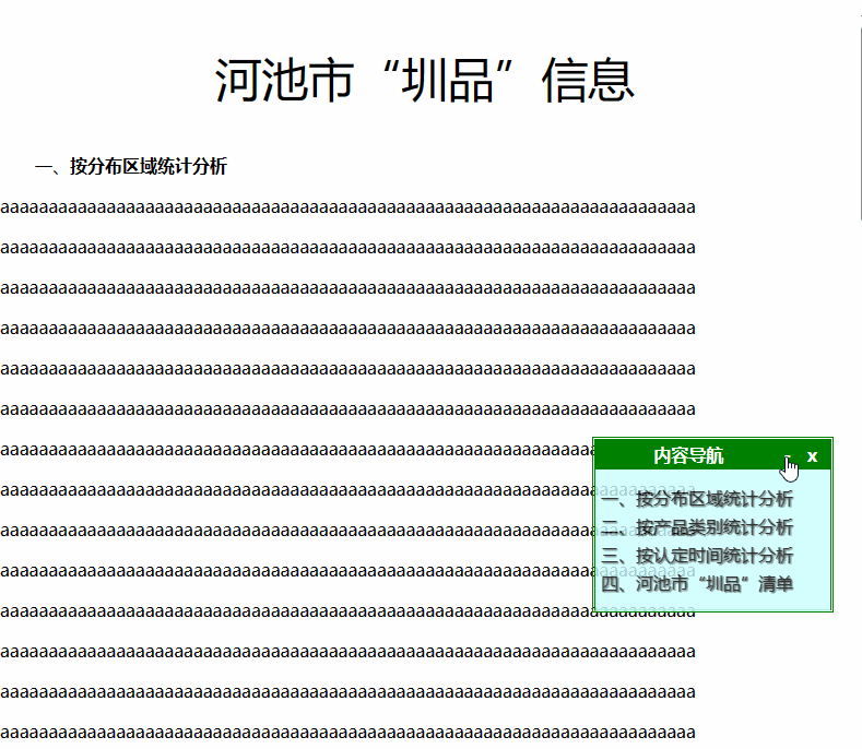 导致网页很长,有同事反映说查看起来不是很方便,于是决定加上一个网页内容浮动导航菜单,把上面这四大块列为菜单项,用户点击相应的菜单项,就跳转到相应的内容,并且提供关闭和收缩、展开导航菜单的功能。如下图:
