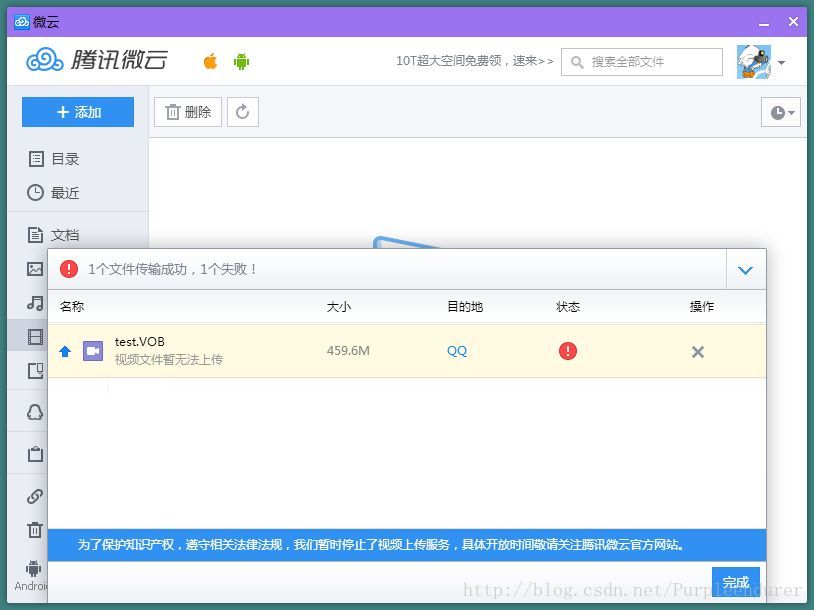 今天想用微云暂存一个视频文件,结果在上传时提示:为了保护知识产权,遵守相关法律法规,我们暂时停止了视频上传服务,具体开放时间敬请关注腾讯微云官方网站。