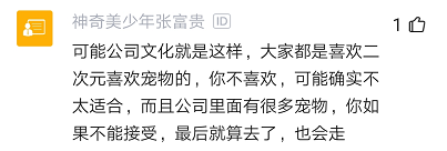 另一类网友觉得:可能有点公司文化就是这样,大家都是喜欢二次元喜欢宠物的,你不喜欢,可能确实不太适合,而且公司里面有很多宠物,你如果去了之后不能接受的话,最后就算去了,可能也会受不了走掉的...