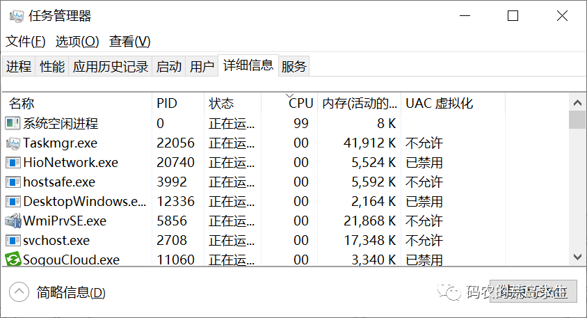 这个问题也很简单,还是以 Win10 为例,打开任务管理器,找到 “详细信息” 这一栏,你会发现有一个 “系统空闲进程”,其 CPU 使用率达到了 99%,正是这个进程消耗了几乎所有的 CPU 时间。