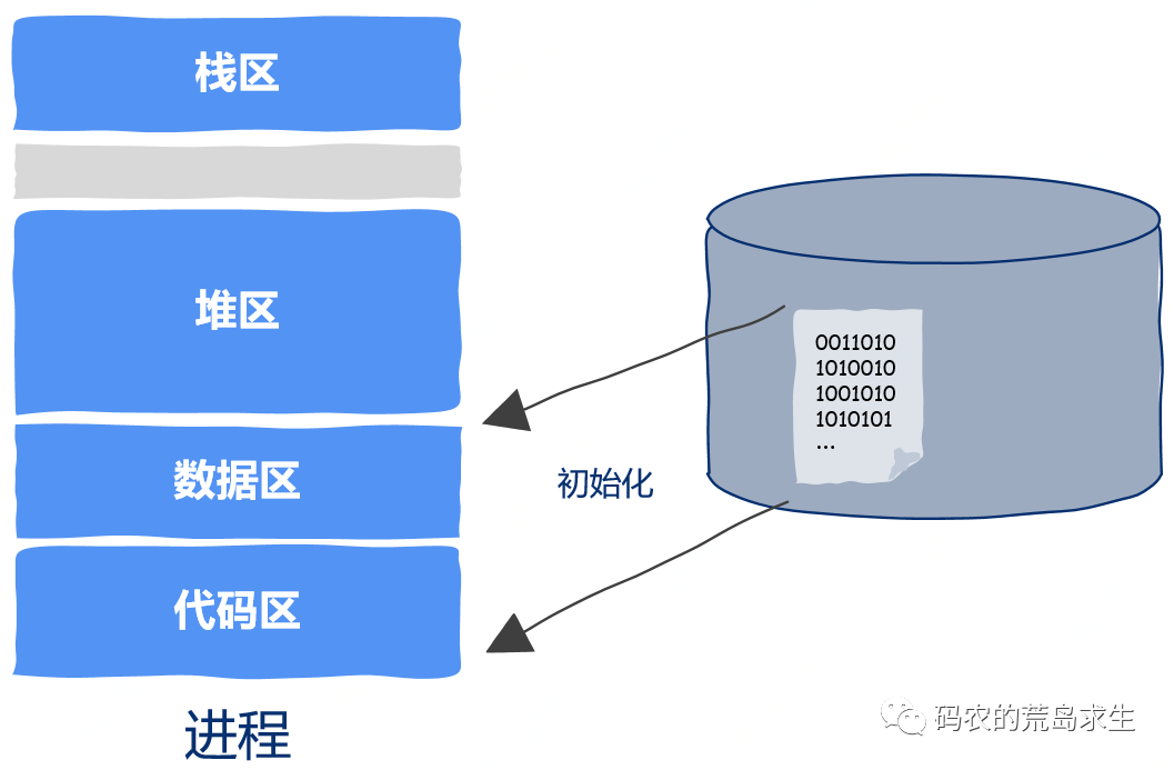 此时操作系统开始将可执行文件加载到内存,解析出代码段、数据段等,并为这个程序创建运行时需要的堆区栈区等内存区域,此时这个程序在内存中就是这样了: