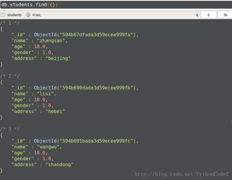 // 创建集合students db.createCollection('students') // 向集合中插入一条学生数据 db.students.insert({name:'张三',age:18,gender:'男',address:'北京市昌平区'})
